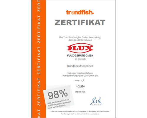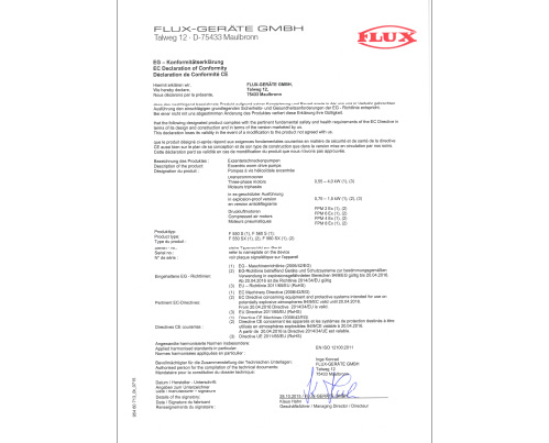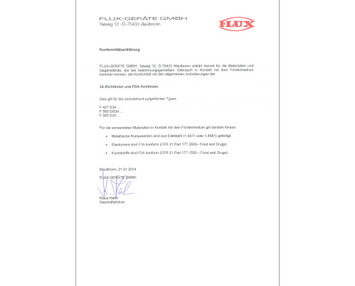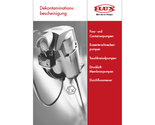 Čerpadla společnosti FLUX jsou vyráběna v souladu s nejnovějšími bezpečnostními normami a podléhají kontrole kvality podle normy DIN EN ISO 9001. Jednotlivé certifikáty a schválení výrobků najdete zde.